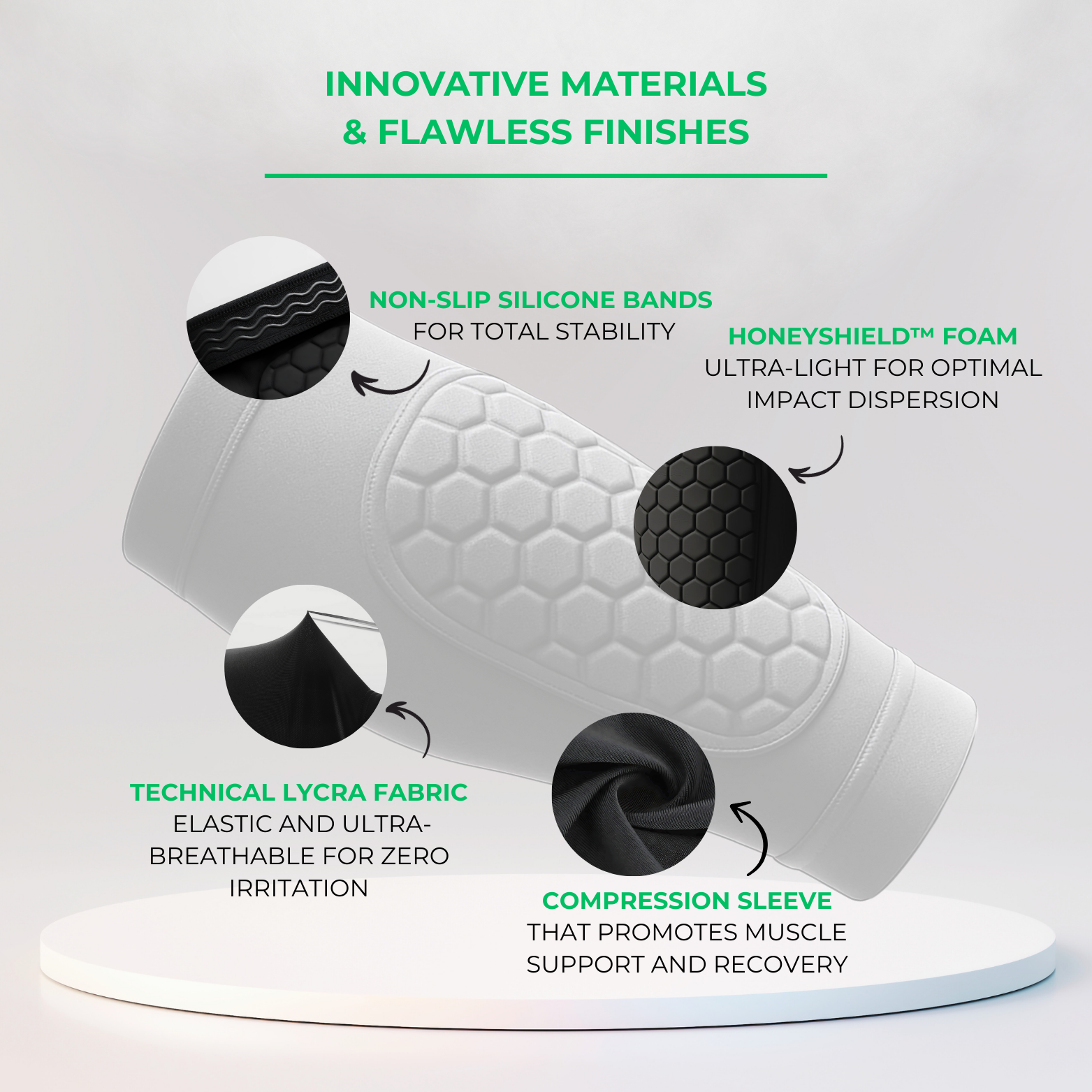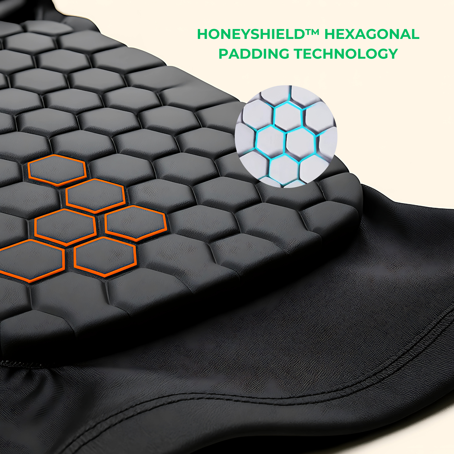 I parastinchi ProtegElite sono realizzati con materiali ultraleggeri ed elastici e utilizzano la tecnologia brevettata HoneyShield™, garantendo una sensazione di totale libertà senza rinunciare alla protezione.