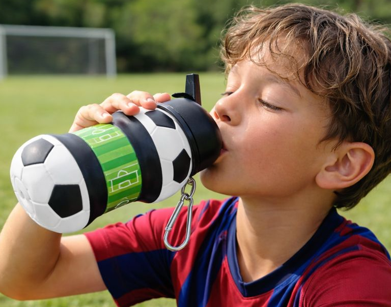 I bambini dovrebbero portare con sé una bottiglia d'acqua a ogni allenamento e a ogni partita, in modo da poter bere a piccoli sorsi regolarmente — non solo quando hanno sete — contribuendo così a prevenire crampi e affaticamento.