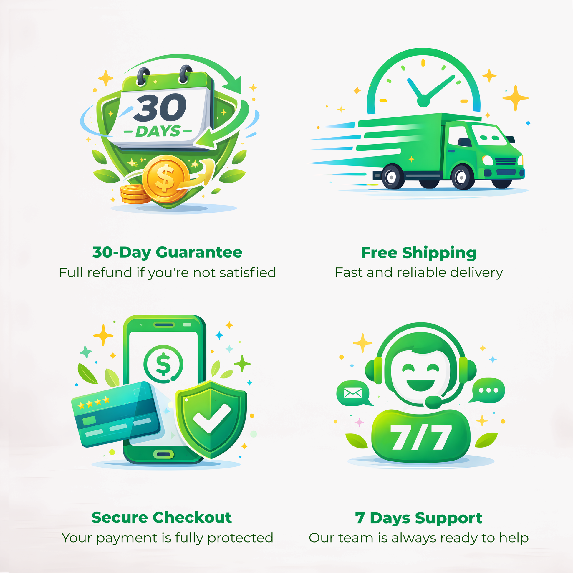 Alle bestellingen worden geleverd met een geld-terug-garantie van 30 dagen vanaf de aankoopdatum, in overeenstemming met ons retourbeleid.