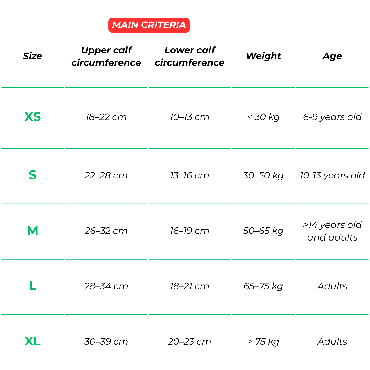 Size selection depends mainly on calf circumference (upper and lower calf).